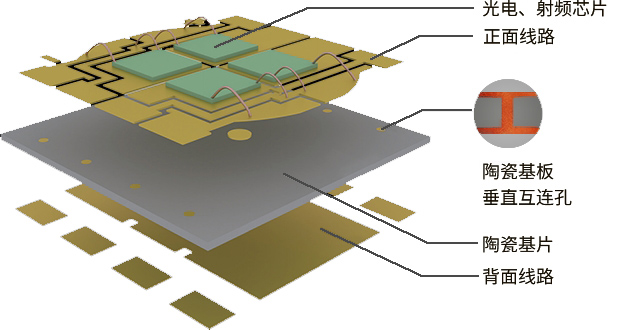 薄膜電路陶瓷封裝基板是一種通過磁控濺射薄膜金屬化與電鍍制程的技術(shù):即根據(jù)應(yīng)用需要,在高導(dǎo)熱的陶瓷基體上,采用薄膜金屬化及影像轉(zhuǎn)移方式制作2D金屬線路,然后采用TCV(Through Ceramic Via) 技術(shù)形成雙面布線間的垂直互連,最后采用堆疊技術(shù)獲得與陶瓷基體結(jié)合緊密的一體式3D金屬框架。基于薄膜電路工藝,通過磁控濺射實(shí)現(xiàn)陶瓷表面金屬化,通過電鍍實(shí)現(xiàn)銅層和金成的厚度大于10微米以上即DPC(DirectPlateCopper-直接鍍銅基板)。